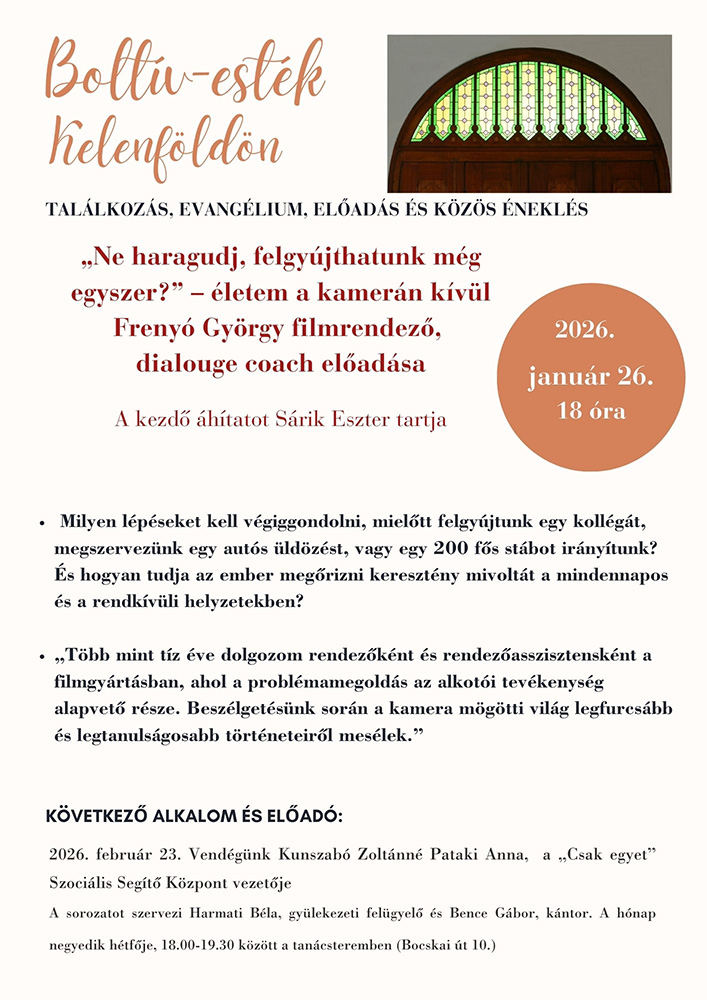 2026.01.18.(7 events) 2026.01.18. – 8 óra úrv. Sárik Eszter Kelenföld – Ismét eljön a hónap harmadik vasárnapja, amikor az istentisztelet előtt együtt reggelizhetünk az otthonról hozott hozzávalókból. Mi tervezünk némi házi kalácsot hozni és tejet a kakaóhoz, kávéhoz. Lekvárok többen is sorakoznak a konyhában bontásra várva az alkalomra. Köszönettel vesszük, ha minden résztvevő is hoz valami megosztani valót. Régi gyülekezeti terem – 9 óra (Farkasrét) Blázy Árpád Farkasrét – 9.30 Blázy Árpádné családi Kelenföld – 10:30 óra úrv. Sárik Eszter Kelenföld – 18 óra Blázy Árpád vespera A Fővárosi Protestáns Kántorátus 1996 óta végez heti rendszerességű liturgikus szolgálatot a vasárnap esti 6 órakor kezdődő vesperás istentiszteleten. A zsoltározó alkalmon rövid igehirdetés mellett a kántorátus és a gyülekezet közös és váltakozó énekével gregorián és genfi zsoltárok szólalnak meg, a kántorátus korálfeldolgozásokat és hetente változó díszes motettákat énekel. Az együttes tagjai gyakorlott kórusénekesek, sokan közülük a fóti kántorképző volt hallgatói. Emellett az Evangélikus Hittudományi Egyetem kántorszakos hallgatói itt teljesítik egyházzenei gyakorlatuk egy részét, a lágymányosi Luther Otthon – Evangélikus Diákotthon hallgatói pedig gyülekezeti gyakorlat keretében kapcsolódnak be a szolgálatba. Kelenföld |